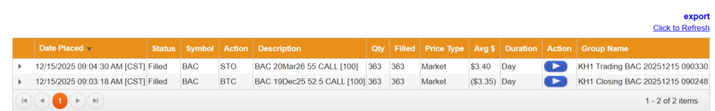 We rolled the BAC $52.50 covered call for $1.01 Credit