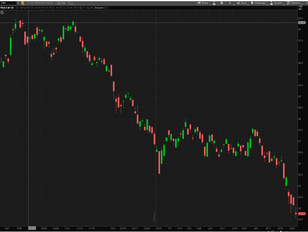 Yield Faltering: The yield on the 10-year Treasury continued to fall Wednesday amid economic growth worries. The benchmark was also below the yield on the 3-month Treasury, a so-called “inversion” that has worried many about the possibility of a recession.Data Source: Cboe Global Markets. Chart source: The thinkorswim® platform from TD Ameritrade. For illustrative purposes only. Past performance does not guarantee future results.