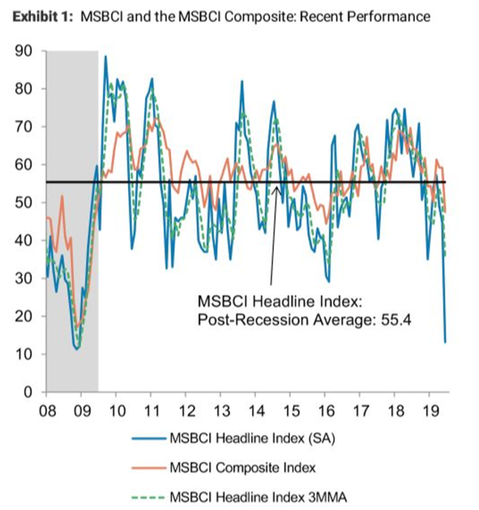 Morgan Stanley’s Business Conditions Index, which captures turning points in the economy, fell by 32 points in June, to a level of 13 from a level of 45 in May. This drop is the largest one-month decline on record and the lowest level since December 2008 during the financial crisis, according to the firm.