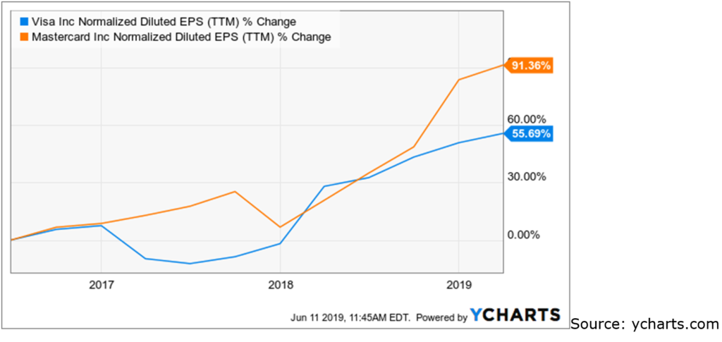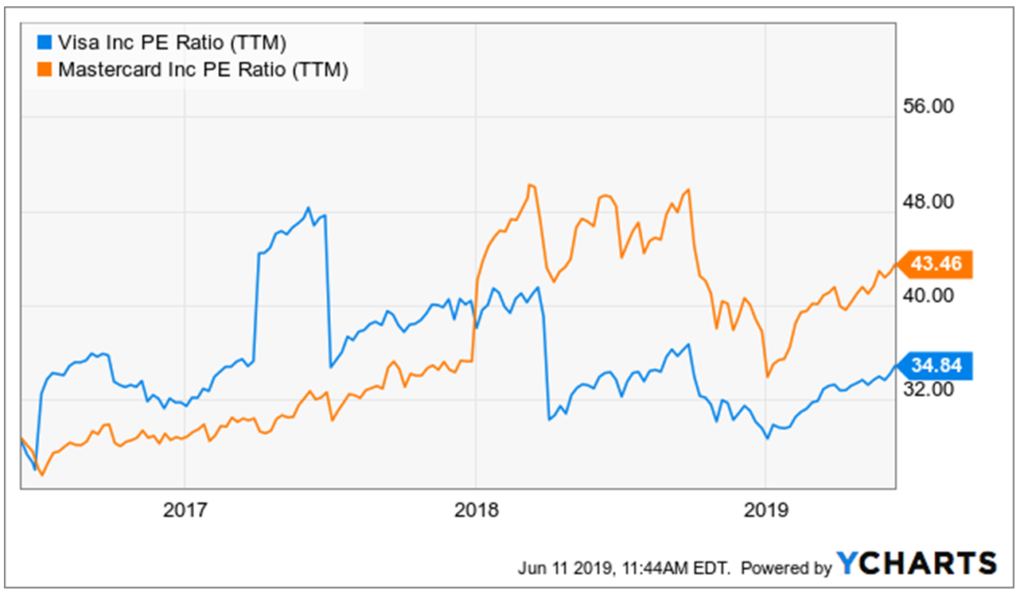 Moreover, we can see that while Mastercard’s earnings per share has grown at a faster pace than that of Visa over the past three years, the stock is also more expensive than Visa on a P/E ratio basis: