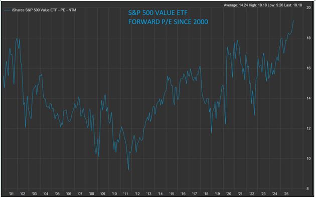 Let’s observe, first, that large-cap value stocks do not look cheap. The forward price-to-earnings multiple of the S&P 500 Value ETF (IVE) is now above 19 for the first time in memory – possibly the first time ever outside of recessions where profits have collapsed.