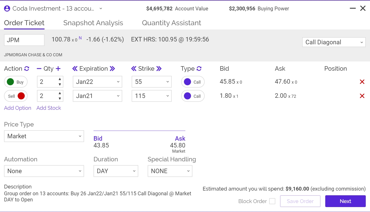 For half the cost and no dividends you could own JPM for $1.05 of extrinsic Value or $46.73 for the next year and 3 months